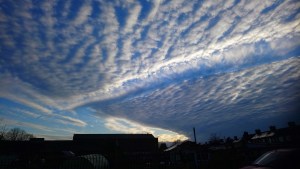 A mackerel sky over Stoke today. A plane had flown through it leaving a slice of blue sky through the blue and white. These clouds usually happen when a weather front passes over the land I think I remember. To me it looked like a huge swans wing was covering the city. The low sun sparkled off sections of it, but as the sun started to set the cloud got darker and moved further over us, the feathery sections moving Eastward away from the sunset.The forecast is for possible rain showers and strong winds tomorrow