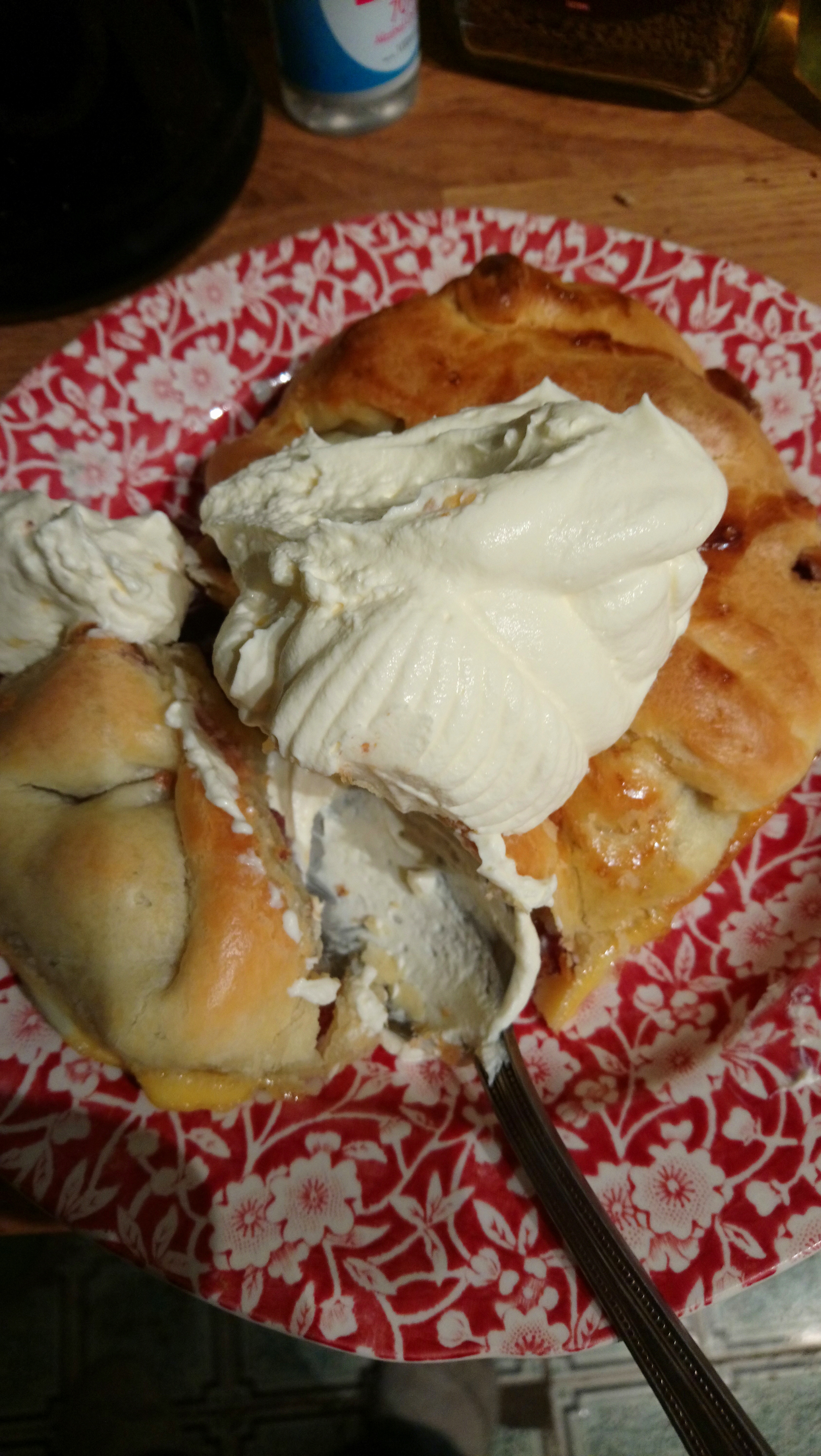 Once the middle layer is set I take a large tub of double cream and whisk it till it is stiff and makes peaks. This is spooned onto the trifle.