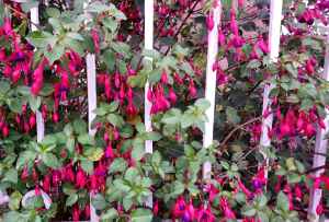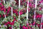 Fushias are beautiful hanging flowers. They can be simple like these or delicate like ballerinas with swirling pink or red skirts or double flowers like flamenco dancers. You can get all sorts of varieties of them. I think they are called F1 hybrids?