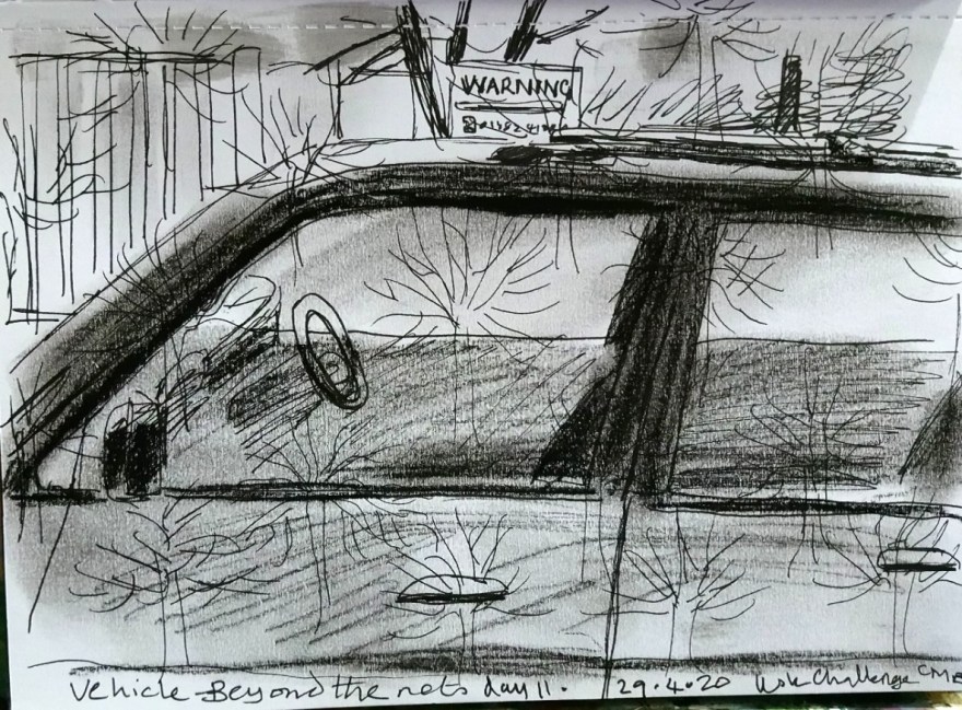 Looking back at old drawings, I did this in April last year. The tree shapes are in our net curtains. I quite like this because it’s a simple way of adding pattern… I’m doing an ‘in/inside’ drawing for a prompt tomorrow. Might play with the idea of inside looking out…..