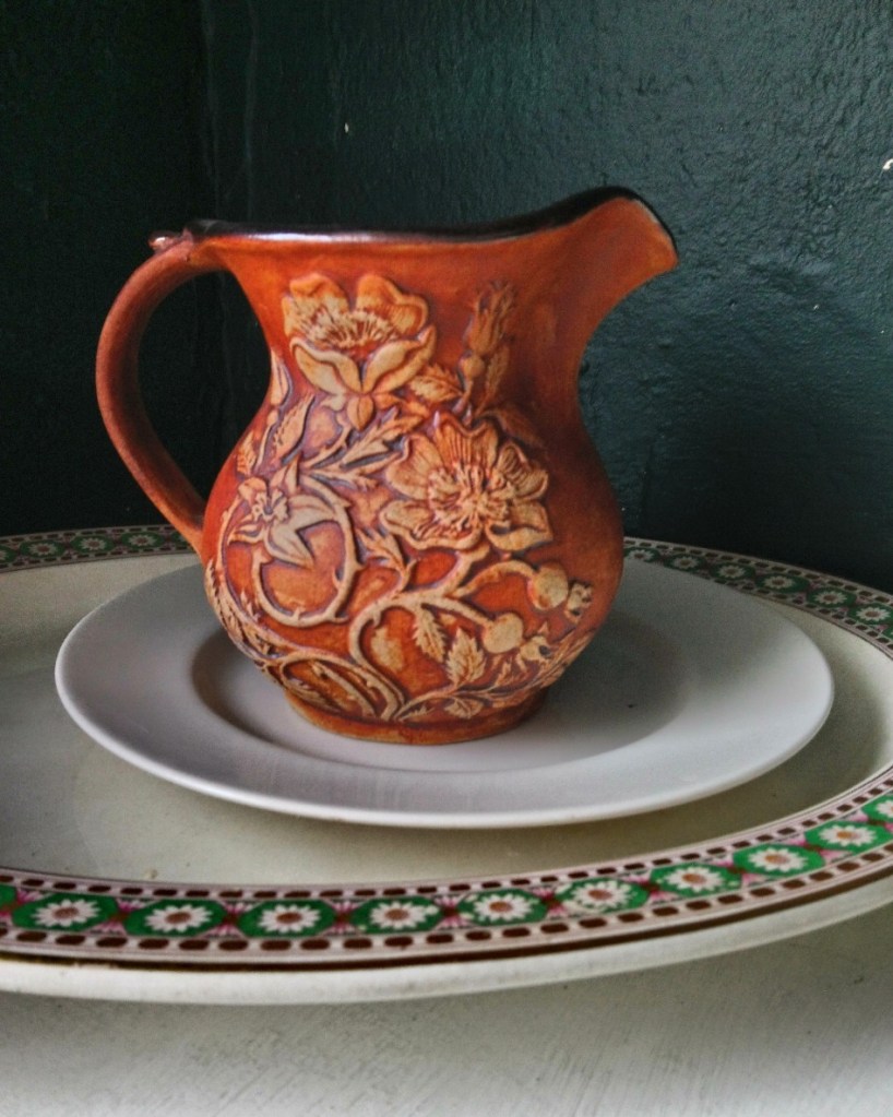 Hmm, still thinking about painting this. I like the colours and the ellipses. It looks good against the dark green background. The pattern on the plate has colours matching in with the jug and the wall. If I paint it I think I will enlarge the jug slightly, it’s a little small for the composition.