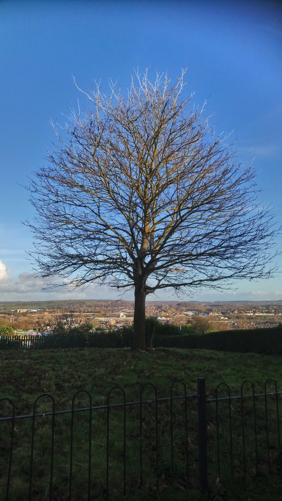 This is where we walked today, up the hill, across the valley of the Trent. Part of the city laid out across the view. We are a long but thin city. Countryside all around us. A lot of green spaces despite the terraces. Not huge and grey like Manchester and Birmingham. Yes we get traffic jams and pollution, our infrastructure is poor, with many bottlenecks for cars and lorries, particularly when the nearby motorway gets blocked and all its traffic hits the cities dual carriage ways. Then again we can be completely blocked up by snowfalls. Ah well, that’s life…. The tree looks out over all of that and just ignores it and carries on growing…