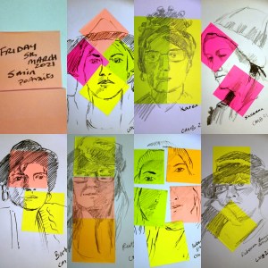 Just playing with post it notes and cut out paper. I wanted to make something fun and silly. I don’t think the bear is aggressive and the bee is buzzing and not bothered. The bee hasn’t been swatted. The bear has teeth but is just looking on, probably admiring it’s honey collecting skills. The bear might go and steal its honey though!