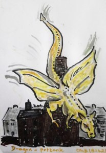 I’m getting obsessed with dragons, thus is a quick sketch of one slithering down a bottle oven at a pottery. I’m imagining it’s been attracted by the heat as the oven is heated up to fire the pottery. I probably should have a plume of smoke coming out of the top of the oven. My dragon is golden like the luster on victorian pottery. I think my dragon is a friendly one.