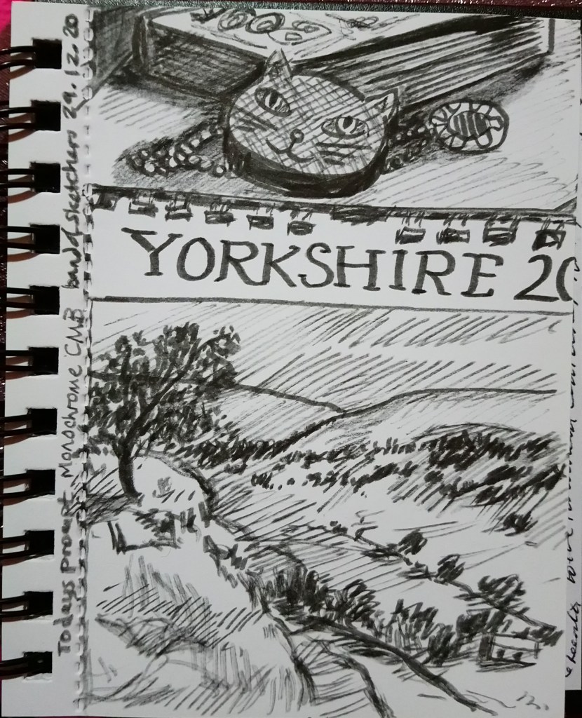 I almost forgot to post today’s prompt for our #bandofsketchers group. The category was Monochrome. I decided to draw a few Christmas presents in black and white. Is that duochrome?