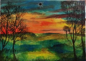 Sketch of an eclipse on canvas in acrylic paint. I challenged myself to just paint with red, yellow, blue, white and black so I had to mix new colours using the primary colours on the pallette. I added a tiny moon surrounded by the corona of the sun visible against the darkened sky. It might be something I paint properly in future.