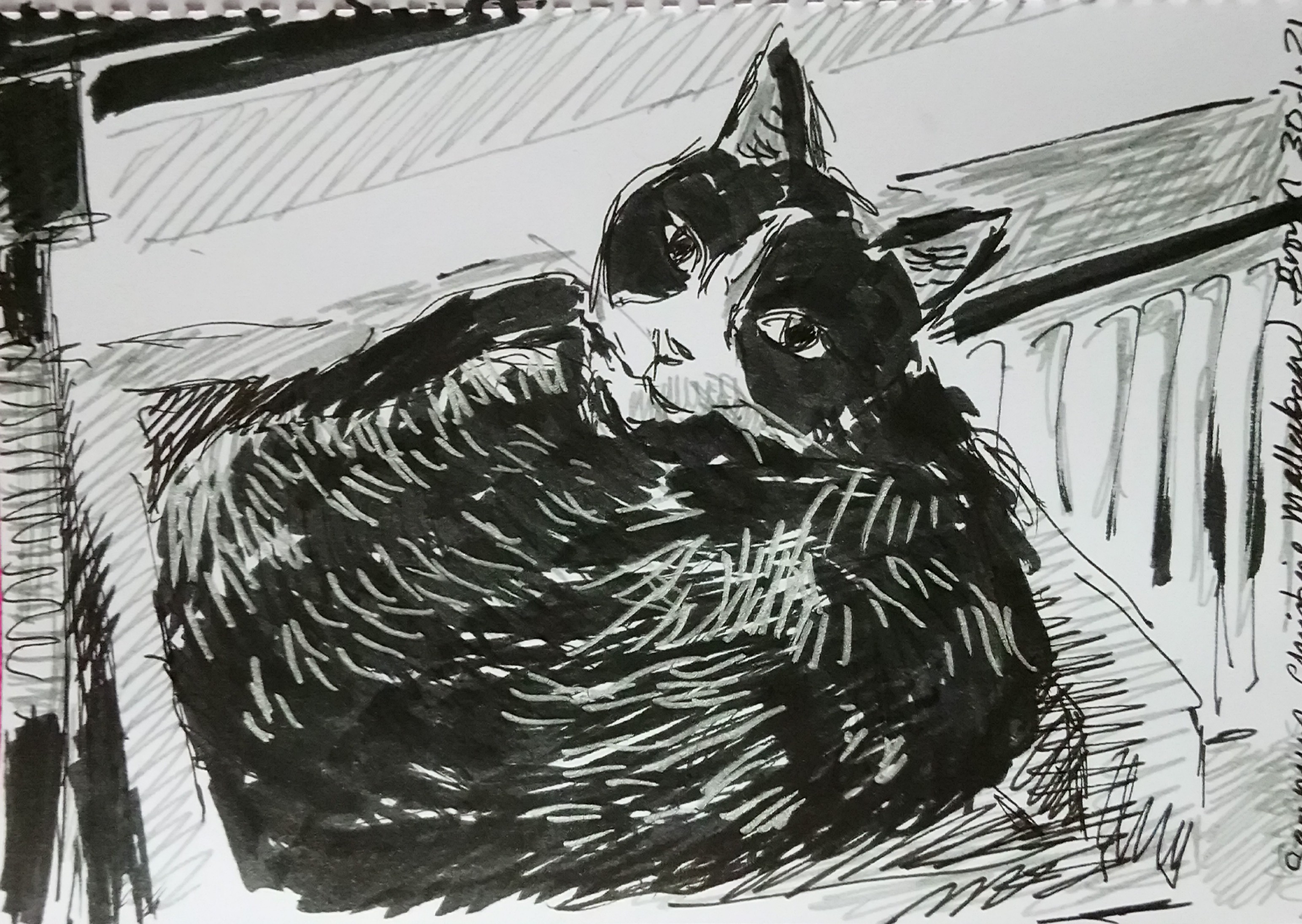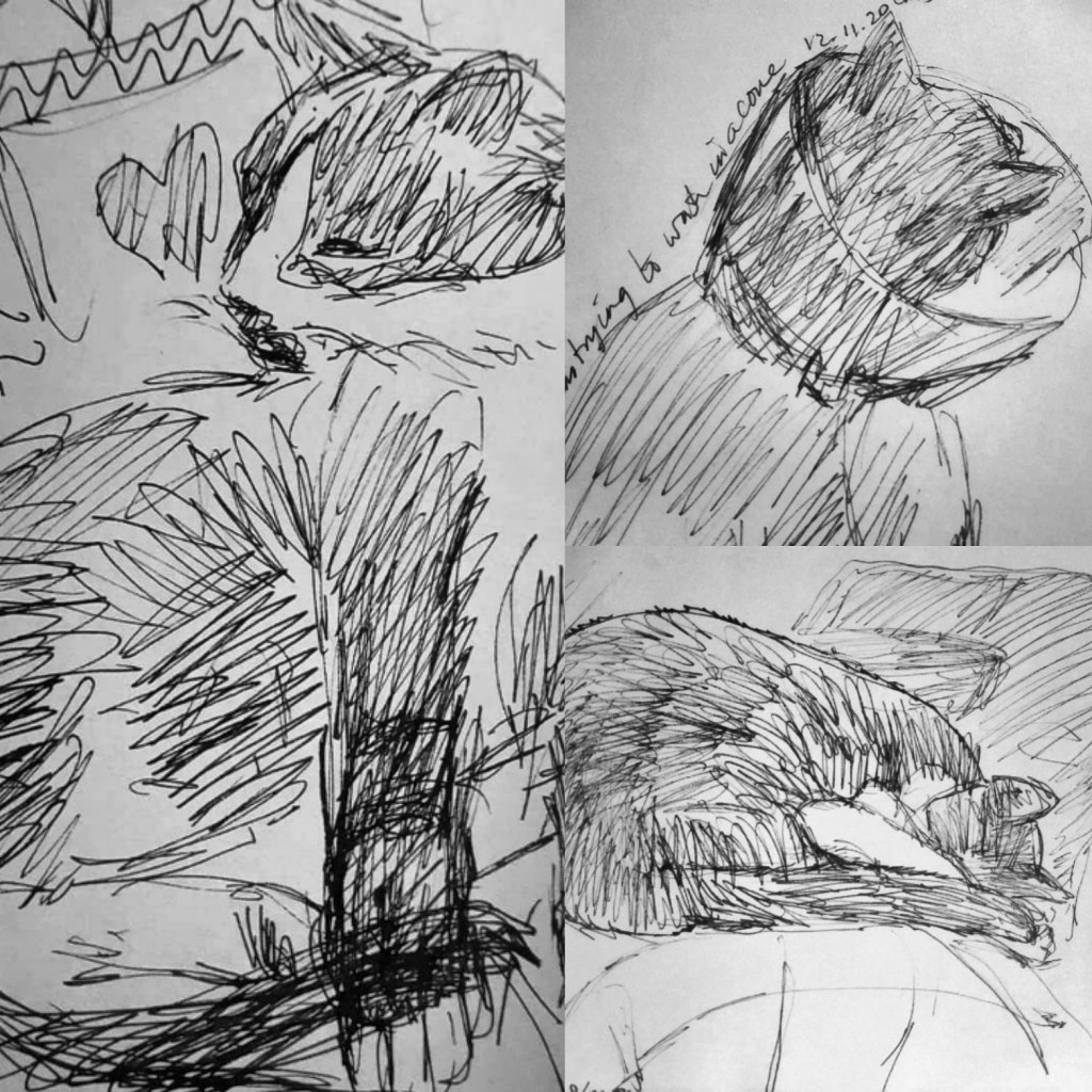 A few sketches of two of our cats. Cats move and I found it difficult to capture the ones where they were moving. Especially with black fur to draw, some of the patches are not the right shape or position, but if you are not aware of the image of the original cat it’s not as important? They are very sketchy..
