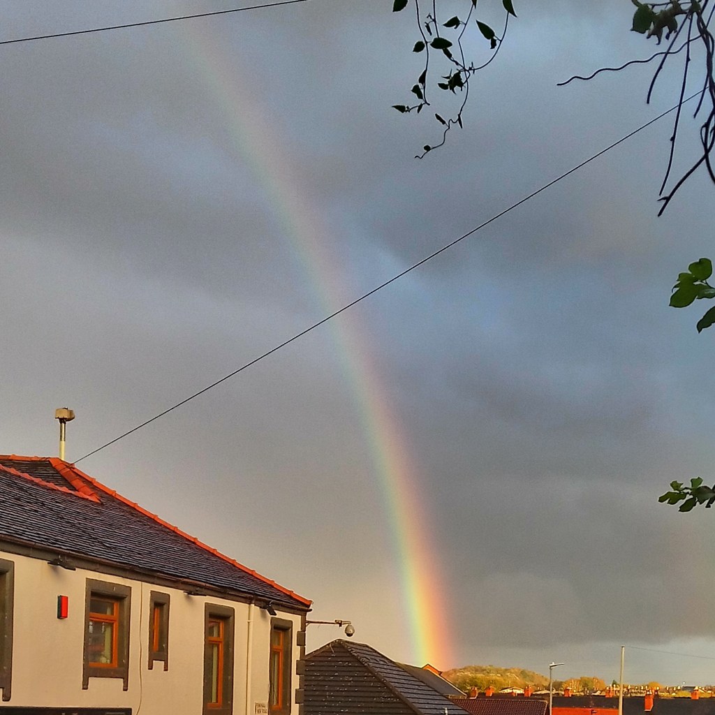 I don’t know what I was doing but I know where I was. At Etruria Flint Mill by the Trent and Mersey canal. How do I know? This picture came up on my phone memories. I love the rainbow flies across the sky with one brilliant end behind the chimney. It looks like a multicoloured comet. I Ts interesting how the area of cloud under rainbows looks paler than the area above. It must be part of the optics of rain storms.
