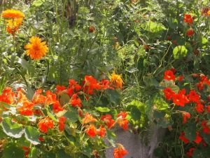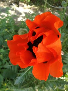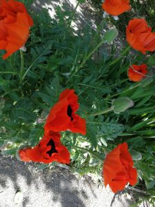 Last week when I saw these on the local allotment they were hardly in bud. Not anymore! They are glorious. The red pops against the greens. The sunlight splashes down onto the plants and paving. A cool breeze made light shimmer over the heads of the poppies. What a warm sunlit spring it’s been. But we might have a drought!