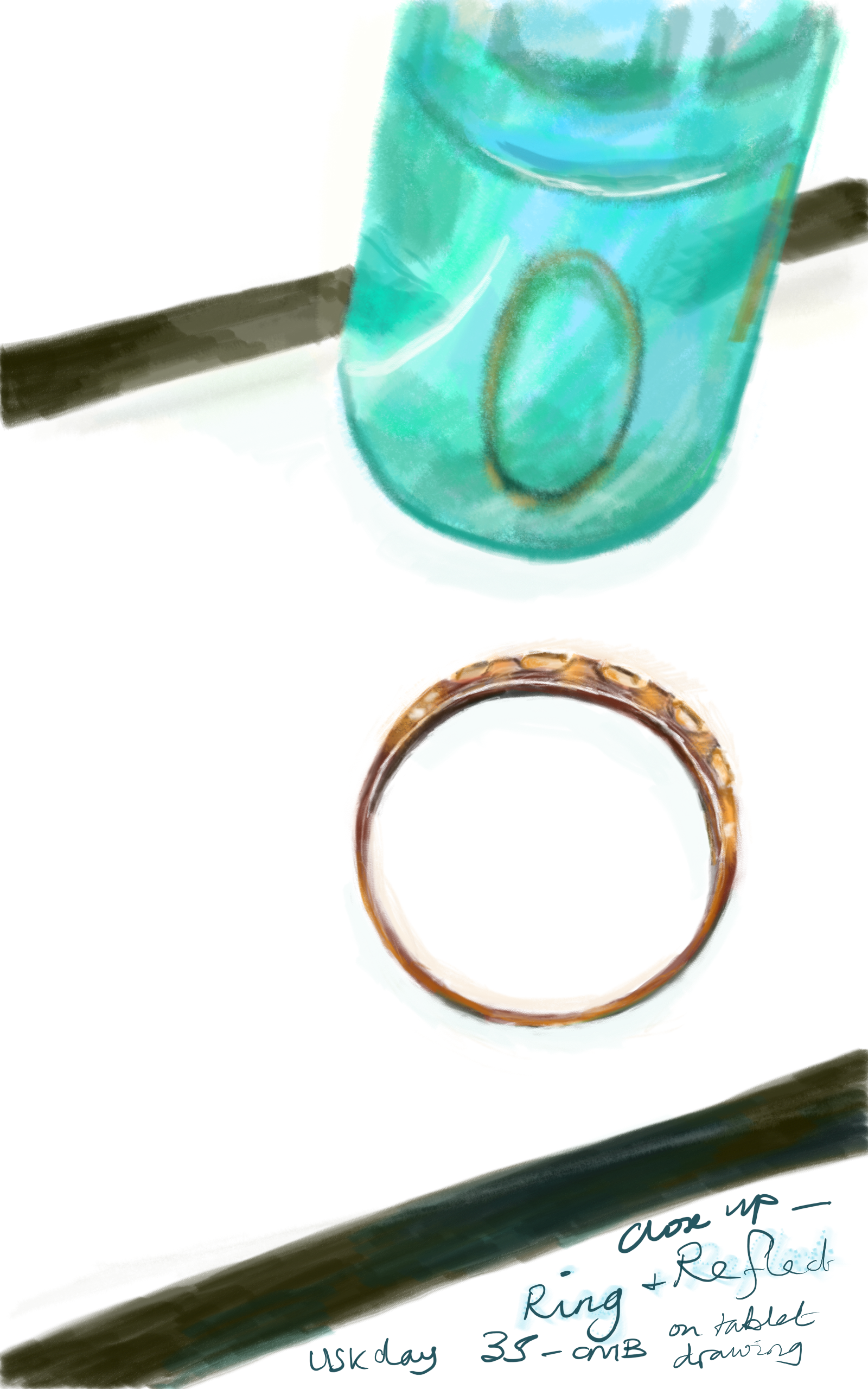 Day 35 and the challenge was to draw a close up. Someone drew a necklace so I decided to draw one of my rings. The green tub is meant to be a plastic pencil sharpener. It was quite reflective and you could see the ring mirrored in it. I actually drew both objects on top of the tablet, so the light was shining up . Its a different method to what I normally do, but I want to try and get some skill back doing this kind of thing.