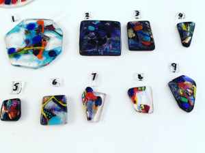 One and eight are my hubbies pieces, the rest are mine. Out of the kiln at Art Glass Lounge. I did them at a workshop. Some are being turned into necklaces, some brooches and a couple will be attached to rings. I’m collecting them tomorrow. I’ve really enjoyed learning such a simple technique of layering glass to get a sparkling result. Can’t wait to collect the finished pieces. I will take a photo of them when I get them.