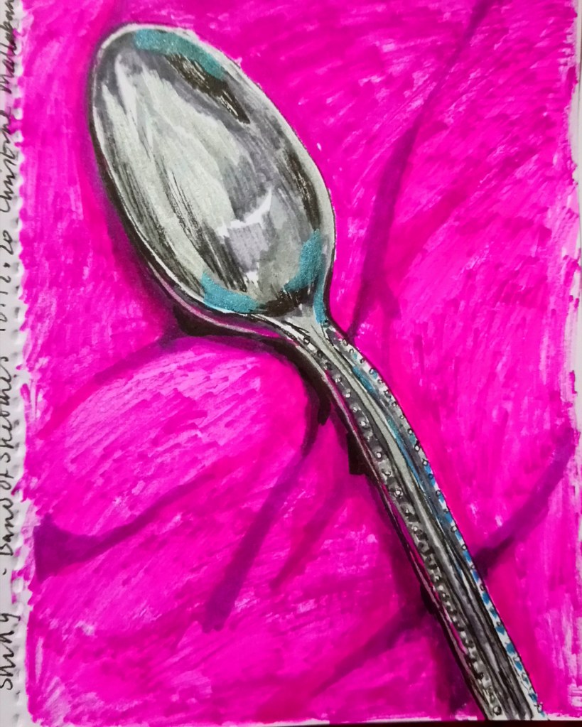 Spoon on a chair throw. My version of shiny… My drawing for today’s #bandofsketchers prompt.