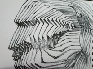 Draw multiple curved lines, add shading. Voilà! You can almost make a three dimensional image. I think this looks like folds in cloth. It’s an interesting optical illusion. The shading makes it look more rounded. It’s the first one of these I’ve done for a while. I used to draw things like this digitally on my computer, but this was drawn with metallic and matt felt pens.. I think it’s quite a good abstract image.