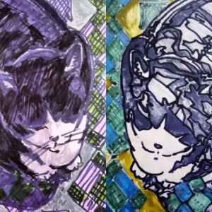 This is one of our cats. Drawn left handed. I could manage the outlinesbut the shading is a bit rough and ready. I used a dark blue ink brush to go over the black shading. I have some nice metallic pens which are useful to create related colours