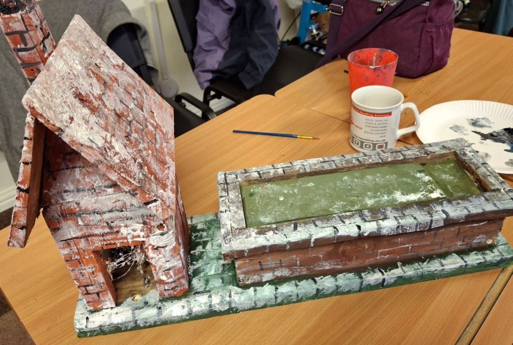 A snowy cottage (with led lights) and a flowerbed for cut flowers. Made by a craft group I’m  in. The wooden  model was  mostly painted with white acrylic to replicate snow. I added dark outlines to indicate bricks, stone and tiles.