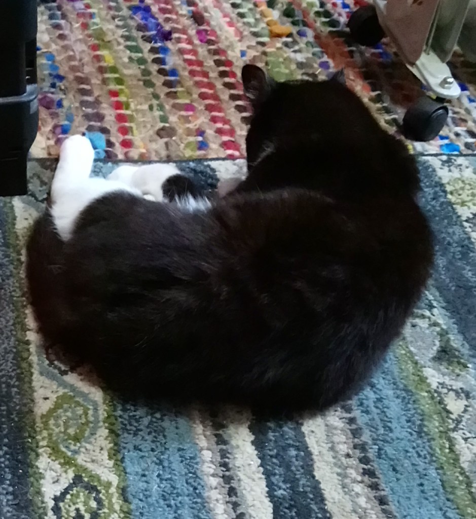 We got a package today in a cardboard box. Before you could say Jack Robinson, one of the cats had co-opted it as a snug, draft free bed. I don’t know how long it will last. He’s slightly too big for it and one of the sides is a bit loose. He’s just lain down after having a good wash. Snuggling and curling, paw over nose.