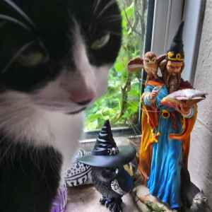 The cat turned to stare at me. She had seen me in the corner of her eye. She had been staring at the wizard as he cast a spell. As his words ended she started to grow. Paws and legs, tail, body, head, ten times bigger? Twenty times. More. She was sitting on the stairs landing, but now her head and shoulders were about five feet above where they were minutes before.