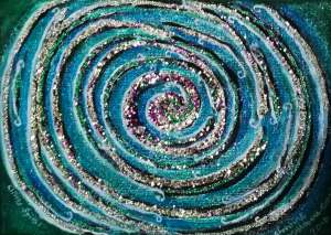 Photo of a drinking glass, it has a ridged blue surface spiralling round the outside. I took this photo looking through it at the TV screen in a darkened room. The curves on the right hand side are my fingers and fingernails. There are pieces of ice at the bottom of the glass. I might put it through apps to see how it comes out.
