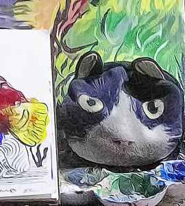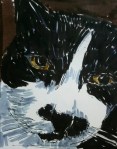 My purse on my chair which I’m using as an easle. Paintings to the side and behind, pallette underneath it. Digitally manipulated. I just thought it looked interesting. The cat really has a strong stare. The way it’s crumpled makes it looks like it’s frowning. I don’t know whether anyone would actually like something like this?