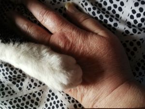 Cat paw on my hand, he likes saying hello. Hello in the morning, when he comes up to me, assumes the “staring” position and waits to be fed! Then sometimes he will reach out with his paw to greet me. My other two don’t do that. One sharpens her claws on my leg, pulling holes in my leggings, the third likes to head butt my hand in greeting. Sweet.