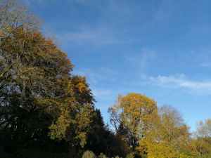 There’s still leaves on the trees and we are almost half way through November! The air hasn’t been very cold so the leaves are only gradually turning autumnal. And we have not had too much strong wind here so they haven’t blown off yet. This was the view from the car park at the garden centre today. A lovely blue sky, bright sunlight from a dazzlingly low sun, trees still in leaf. Feels like summer except it was quite cold.