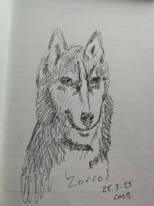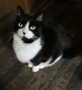 Like all my cats she’s black and white with piercing golden green eyes. A resl character.