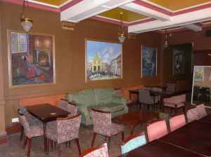 This was the back room of the Leopard Hotel in Burslem (the Arnold Bennett suite). The hotel burned down last year taking my murals with it. They were painted in emulsion paint directly onto the walls so it would have been impossible to remove them before the hotel caught fire (apparently the empty hotel had someone growing cannabis in it and the fire was from an electrical fault. It had been bought for redevelopment and the local community wanted to take it over to make it work again. Now its gone. You can see the relative sizes of them to the size of the room. I painted them between 2006 and 2007. I miss them.