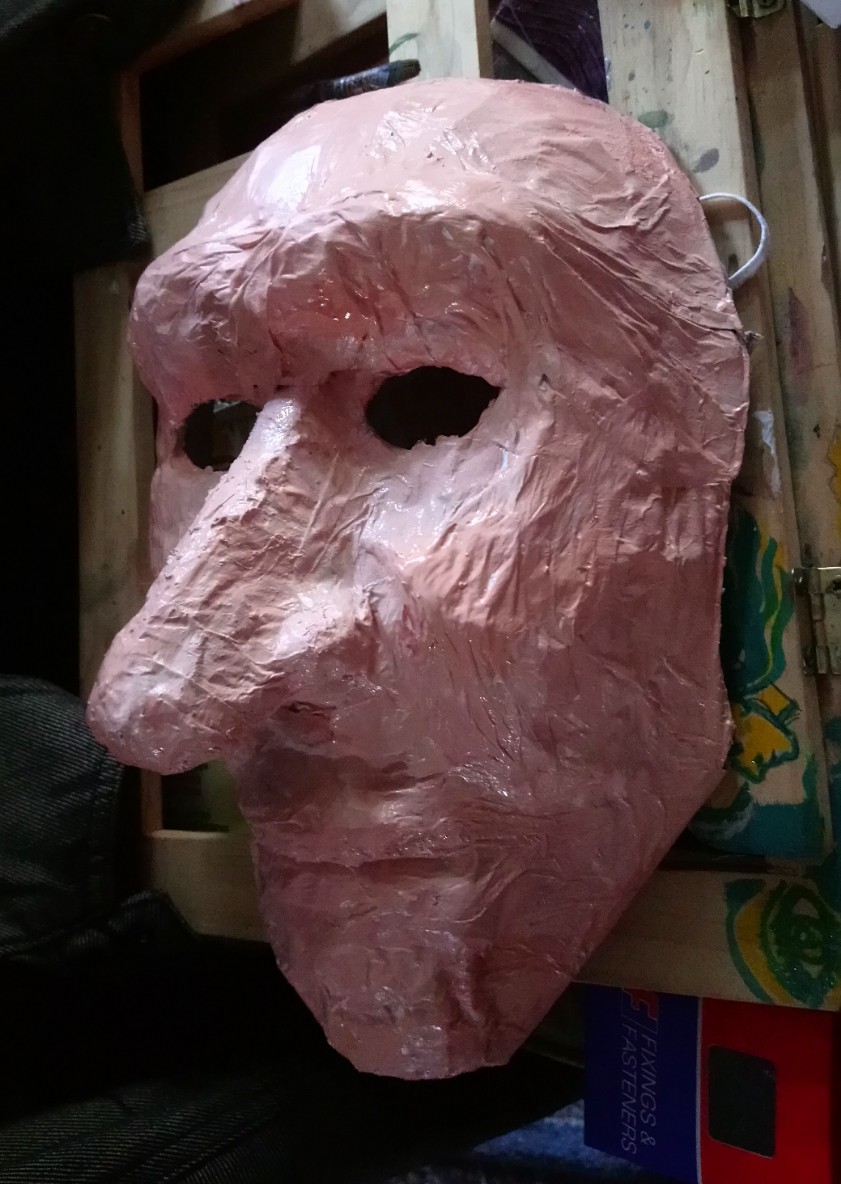 Theatrical mask made by a friend for 2019’s Penkhull Mystery play. Strange that sux months later we had to wear real masks! I painted this up with my hubbies features. He had to sit still at a potters wheel and pretend to be a mannequin until the cast were transported back in time. Then he took it off and became Thomas Doodey, Master Potter.