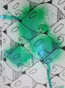 Pattern making again. Using greens ink spray that has a sheen to it. Then I drew scale patterns over the top. Finally I wanted three simple elements to add to each scale or tile that would give it an art deco? feel. So I added a wave shape, a dark patch and some vertical lines. With these patterns I think the scales started to look a little like birds.