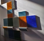 Group of blocks, duplicated in a symmetrical pattern. I think the blues and oranges of the tiles, which are complementary colours add to the composition, as do the strong diagonals created by a bright shaft of sunlight. This was originally a photo taken in the shop at Middleport pottery, I think taken in the autumn.