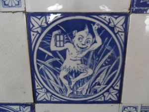 Photo by a friend of a tile found in the basement of the old Stoke Library. I think he said it was by Minton tiles. This is also similar to the green imp badge that the brownies have on their uniform. (Brownies are younger members of the Girl Guides movement.)