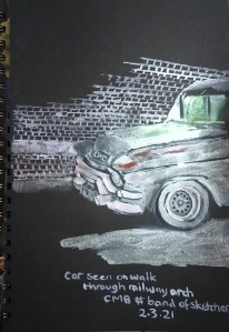 Walking through a railway arch we saw this 1950’s GMC truck. So I decided to have a go at painting it tonight in my black cartridge paper sketchbook. Used Windsor and Newton Watercolours and Arteza metallic watercolours.