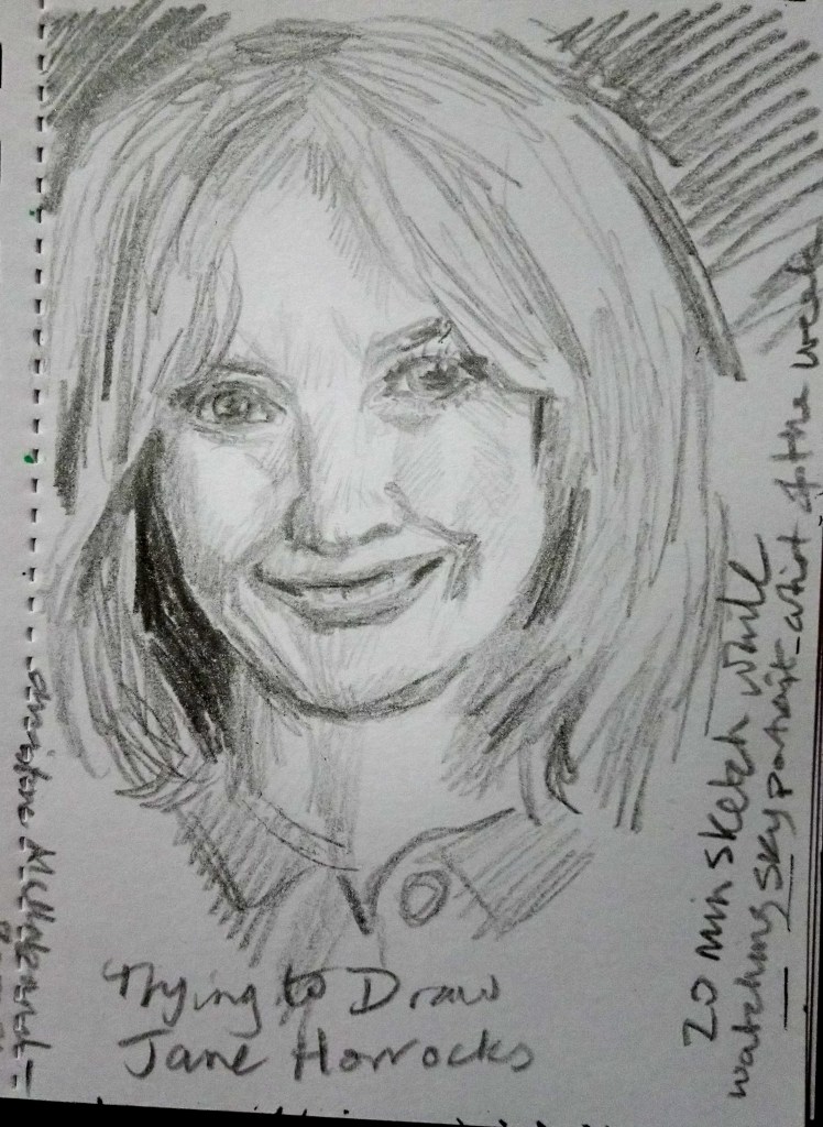 Tried drawing Karen Gibson, the conductor, in felt pens after watching her having their portrait painted in #skyportraitartistoftheyear tonight. The hair is wrong, her left eye is too far back, but I don’t think it’s too bad. I drew with felt pens because one of the contestants had done. This took me about twenty minutes. I should have possibly taken longer.