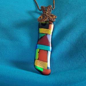 I’m pleased to say one of my necklaces, made of dichroic fused glass has gone to a good home. Fused glass is a way of heating and melting various colours of glass together to make a unique pendant.