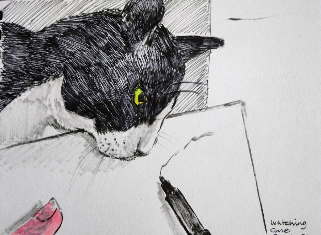 Oh yes! She tried to get my pen and rubbed her head along my sketchpad. I took a blurry photo and then drew this. Sometimes the paw comes up and she tries to grab my pen. Eyes staring at the tip of it. What fun… Maybe she was an artist in a past life!
