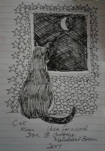 An idea from 2017 for a design for a cat and moon and stars. It’s not a good photo but I like the idea and I wish I’d got round to sorting the design out and getting it printed off. This is only an initial design. I would have strengthened the black areas and line work. It’s nice to remember this.