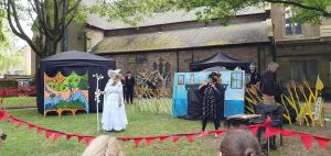 It went well considering the wind was very breezy and because we don’t use microphones, you really have to project your voice. The children, who had been quiet during the rehearsals really upped their game and could be heard. In one small scene I had to push a “boulder” (hula hoop and black cloth) in front of a creepy cave to trap the children. I pushed the boulder, said my line, walked off and the dratted thing blew over, flat! Luckily the audience laughed in amusement.