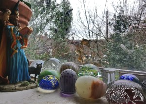 A wizard figurine hides behind our money plant upstairs. If he was originally a real wizard something has minaturised him and turned him into resin! Anyway if he’s casting a spell he’s not being very successful!