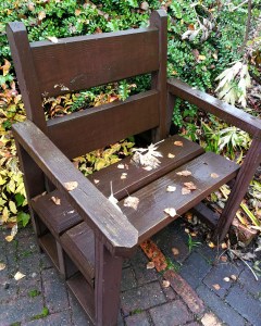 It’s wet under the trees, and the old bench that sits next to the kitchen gets damp. We don’t sit on it very often and it’s started to fall apart. I guess we should have varnished it when we got it. Maybe we should replace it with a metal one? Now it’s basically used for pots and potting on. The moss is getting rampant. The leaves need clearing up. Oh well, we live and learn.