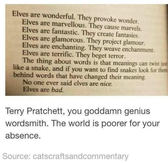 I read the book this quote was in, I think it’s got the character Granny Weatherwax in it, (who often holds a sign when she’s possessing another animal and leaves an apparently lifeless body, “I ain’t dead yet”) but I can’t for the life of me which Terry Pratchett book it is in, (he wrote so many). I recommend him as a funny fantasy writer.