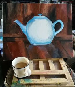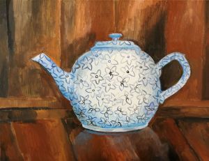On the easle today, a friend wants a blue and white teapot painting, (acrylic on canvas).
