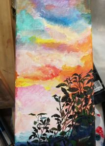 While I was at the group art exhibition yesterday I did some painting. One of them was this small oblong painting of an apple tree at sunset. This is a little work in progress. I’m trying not to muddy the colours. The sky needed to be light and fresh. More to do? More leaves, maybe a little better blending of the blues. Acrylic on canvas.