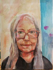 Latest photo of my self portrait. I think its getting better although it might be a bit too peachy coloured. I need to sort out the hair, it’s hard to decide when to stop. Acrylic on canvas. I have done a few self portraits over the years. This might be my last! I think I’ll call it portrait of the artist as an old lady!