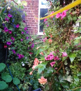 The red flowers seem to be the main things that are still flowering. The yellow line at the top is our washing line, but it’s hard to dry clothes on it in the summer.