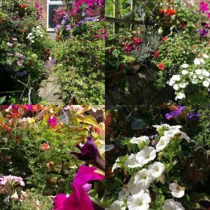 A small space crammed with flowers. My sister and a friend helped me hang the baskets and cut back a lot of overhanging ivy that was shading the yard.