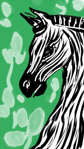 I only had an hour at art group today so I messed about and came up with this. It’s a semi abstract painting of a horse/zebra. I was concentrating on a limited pallette, green, burnt umber, a lighter brown, silver and white. First I painted the horse and highlighted it in green, then I added the gnarly tree. Finally I added textures, including the striped zebra idea. I think it has a vague medieval feeling. I’m calling it finished. Acrylic on canvas.